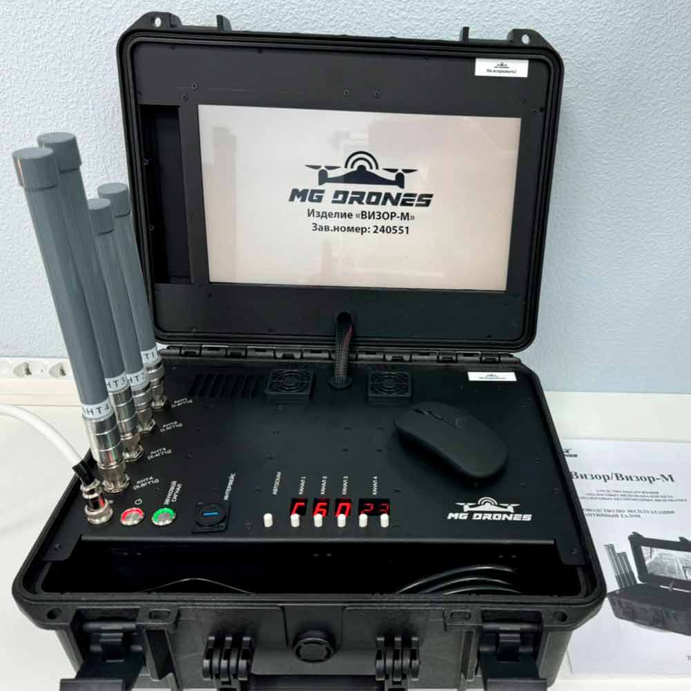 Аппаратная архитектура “Визор-М” включает четыре независимых приемника, работающих параллельно в диапазонах 1.2 ГГц, 1.5 ГГц, 2.4 ГГц и 5.8 ГГц. Данная конфигурация обеспечивает одновременное сканирование всех частотных диапазонов и визуализацию до четырех видеоканалов на высококонтрастном 14-дюймовом дисплее. Эффективность системы подтверждается способностью перехватывать аналоговые видеосигналы с квадрокоптеров на дистанции до 5 км при использовании направленных антенн, а с усиленными направленными антеннами — на впечатляющем расстоянии до 30 км.