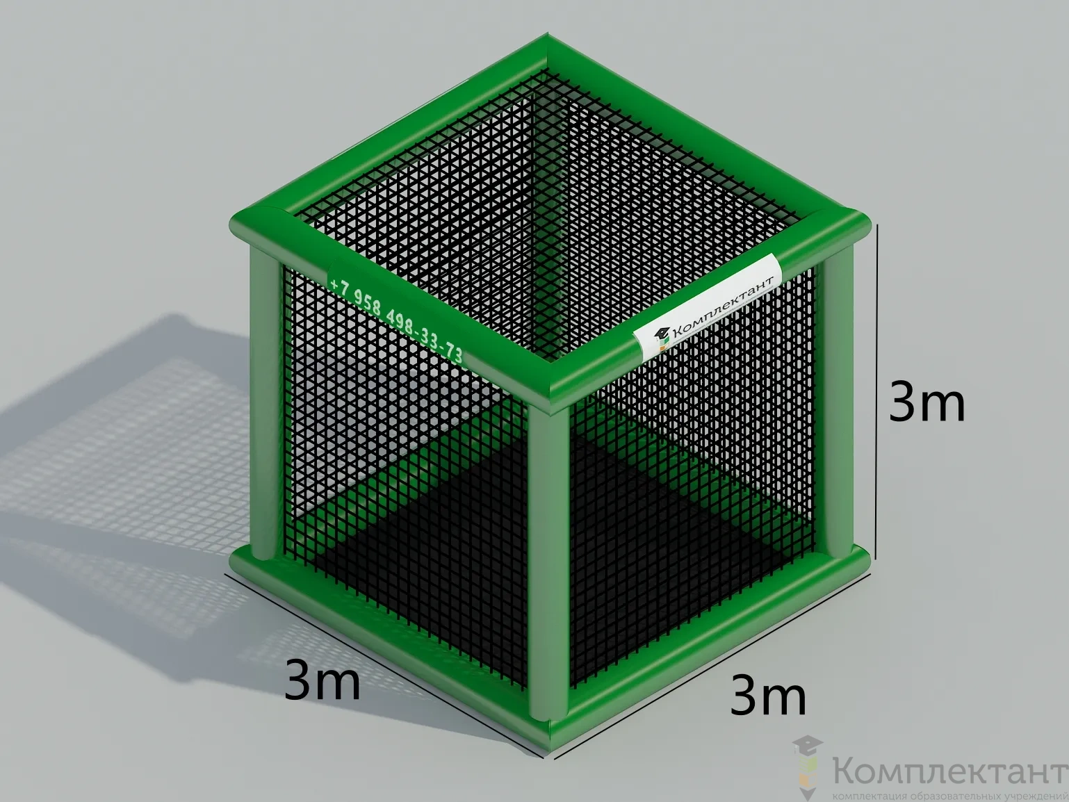 • Сетчатый куб имеет размеры 3м высота × 3м длина × 3м ширина (3×3×3), которые соответствуют требованиям для проведения соревнований по дрон-футболу