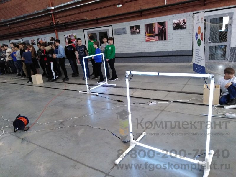 Трасса для проведения соревнований по дрон-рейсингу, включающая в себя поворотные флаги, курсовые ворота, площадку для взлета-посадки, подвесные кольца