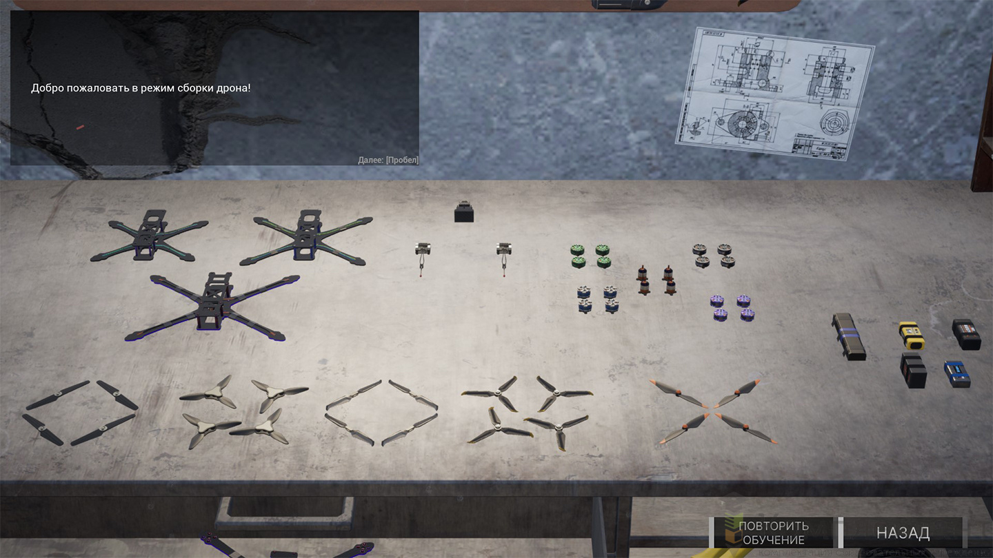 - Мастерская, состоящий из подраздела «Сборка дрона», знакомящего с последовательностью сборки и основными элементами дрона, и подраздела «Конструктор дрона» позволяющего выбирать готовые модели дронов, редактировать существующие или собирать новые и сохранять их