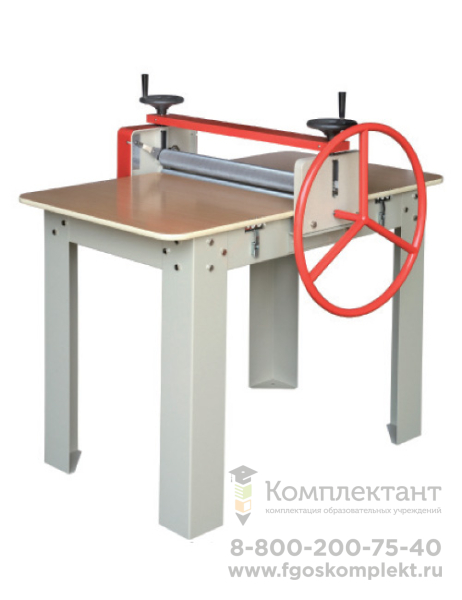 По центру рамы с помощью кронштейнов установлена система прокатки, по обе стороны от которой размещаются столешницы с влагостойким покрытием. Столешницы крепятся при помощи пружинных замков, что позволяет легко снимать их для чистки. Система прокатки представляет собой металлическую конструкцию, состоящую из двух валов, один из которых соединен с поворотными рукоятками регулировки толщины глиняного пласта. Система из двух валов равномерно распределяет давление на пласт. Рукоятки соединены между собой металлической цепью, что дает возможность устанавливать толщину пласта, используя одну из ручек. Шкала регулировки позволяет устанавливать толщину пласта с точностью до миллиметра. Прокатка глиняного пласта плавно осуществляется в обе стороны с минимальными усилиями при помощи большого колеса (60 см в диаметре). В комплекте поставки имеется ручка, при помощи которой также может осуществляться вращение валов. Глина прокатывается между двумя полотнами из бельтинга, что позволяет легко снять пласт после прокатки для дальнейшей обработки, а также избавляет от необходимости оперативной очистки раскаточного стола.