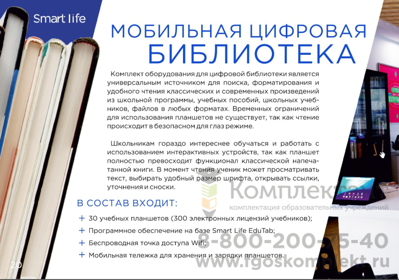 Школьная мобильная библиотека. В состав комплекта цифровой школьной библиотеки входят:- 30* рабочих мест на базе планшетных компьютеров Samsung - предустановленное специальное программное обеспечение «Цифровая библиотека Smart Life»  - цифровой контент (более 2 500 электронных книг классической литературы на базе электронной библиотеки ЛитРес:Школа) - мобильная тележка для хранения и зарядки планшетных компьютеров (опционально)