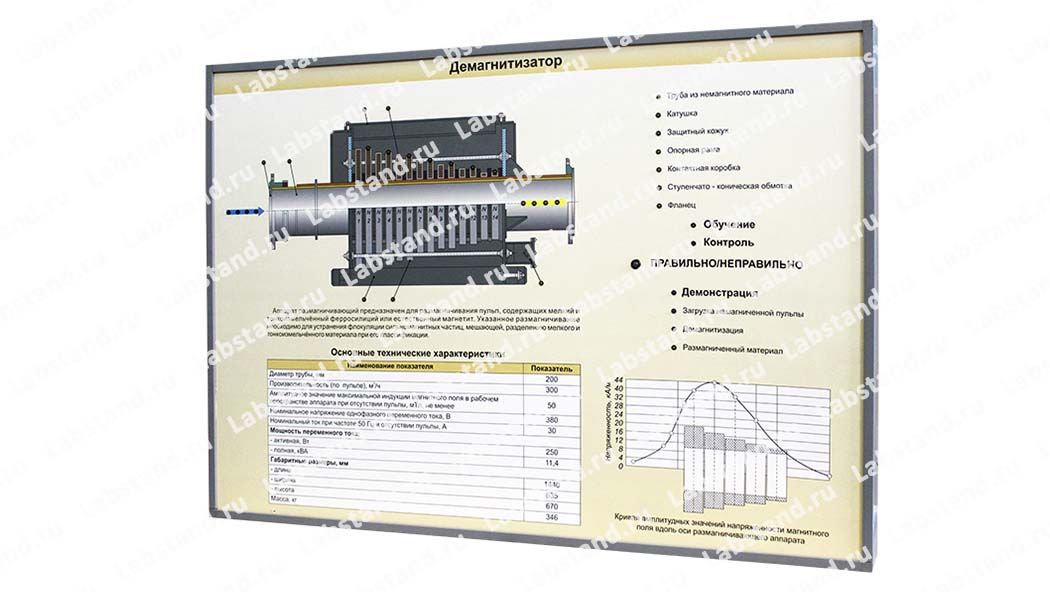Описание: Стенд-планшет представляет собой жёсткую лицевую панель из МДФ толщиной 8 мм, в пластиковом каркасе толщиной 90 мм. На лицевую панель наклеена полимерная подложка с цветным изображением демагнитизатора, отражающим его принцип работы и устройство. Внутри каркаса расположен контроллер управления логикой стенда. С целью наглядной иллюстрации принципа работы и устройства установки на лицевой панели установлены динамическая светодиодная подсветка и магнитные сенсоры для реализации режимов «демонстрация», «обучение» и «контроль». В режиме «демонстрация» осуществляется светодинамическая демонстрация принципа работы установки. В режиме «обучение» при выделении одного из элементов установки загорается светодиод напротив соответствующего наименования элемента. В режиме «контроль» учащийся должен сам сопоставить наименование элемента с его изображением на лицевой панели.