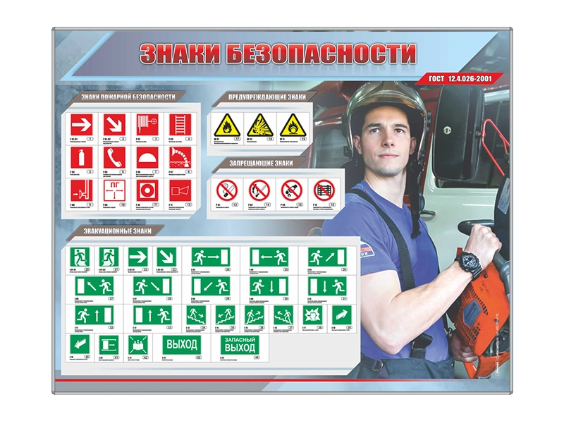 Стенд представляет собой информационную панель, на которой изображены цветографические изображения знаков пожарной безопасности, с кодами и смысловыми значениями.
