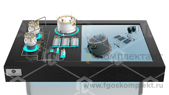 Стационарный интерактивный макет на мобильной платформе позволяет изучать последовательность и логистику технологических процессов установки электро-обессоливания и обезвоживания нефти с возможностью сенсорного ввода и управления, отображать трехмерные разрезы выбранного элемента оборудования на дисплее макета.