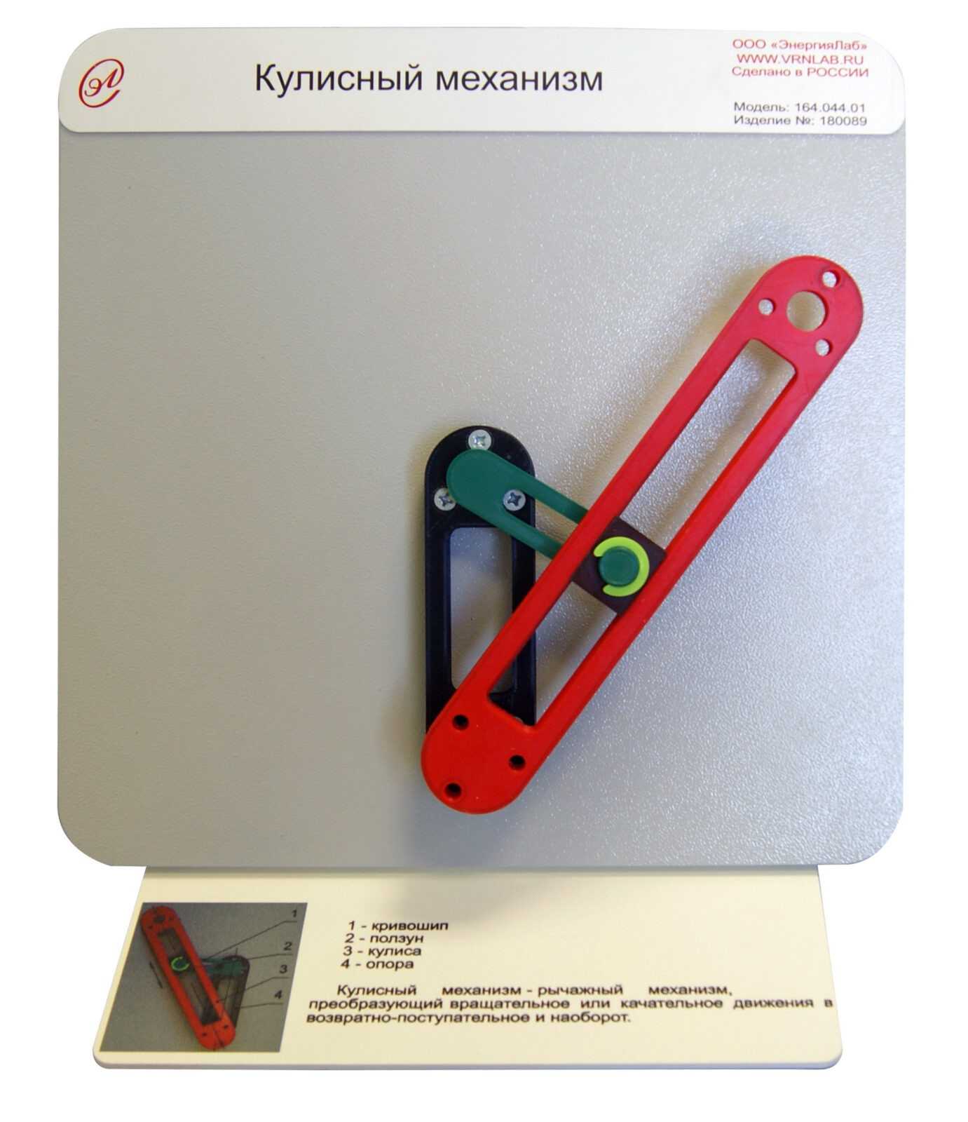 Модель "Кулисный механизм" предназначена для демонстрации - рычажный механизм, преобразующий вращательное или качательное движения в возвратно-поступательное и наоборот.