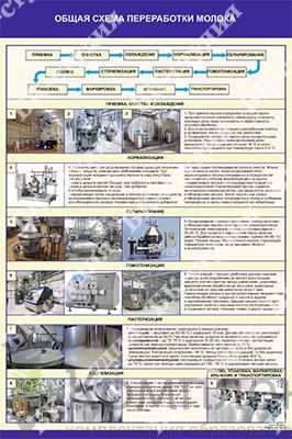Стенд содержит блок-схему с отображением последовательности этапов переработки молока, а также информацию по данным этапам