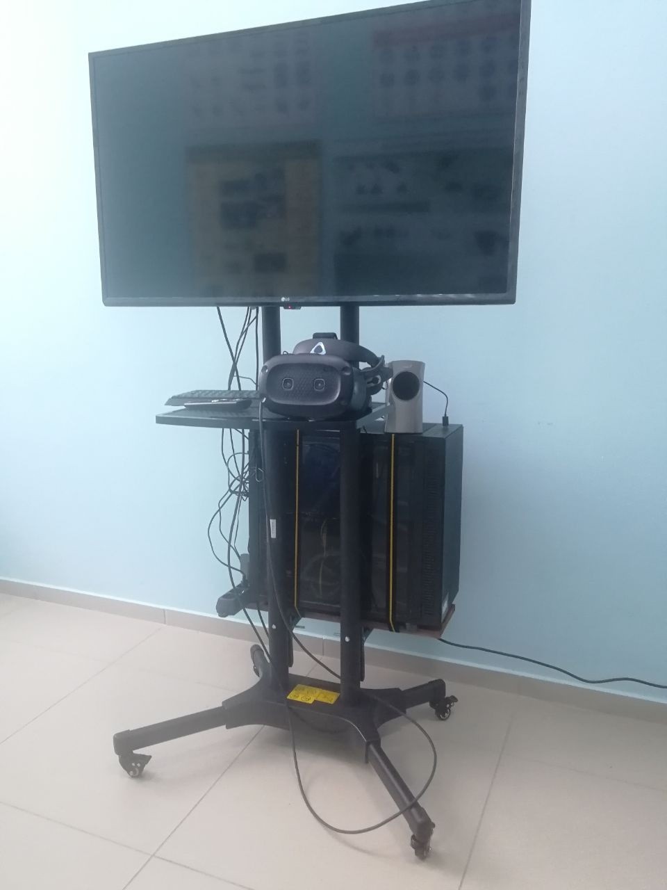 Программно-аппаратный комплекс по обучению колеровке автокрасок и покраске авто. Комплекс позволяет производить обучение как при помощи VR средств (Cosmos Vive Elite), так и при помощи работы на сенсорной ТВ-панели.