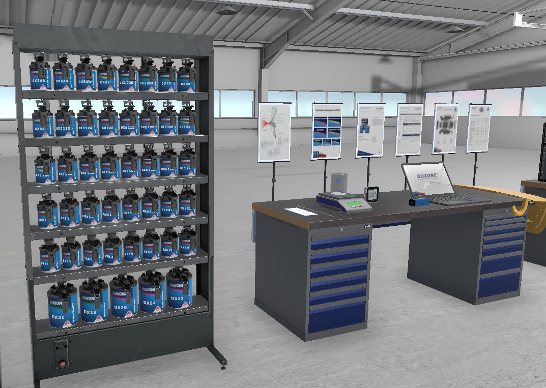Программно-аппаратный комплекс по обучению колеровке автокрасок и покраске авто. Комплекс позволяет производить обучение как при помощи VR средств (Cosmos Vive Elite), так и при помощи работы на ТВ-панели.