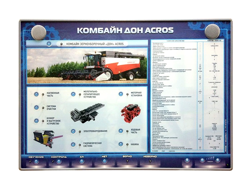 Электрифицированный стенд представляет собой информационную панель с раздельной световой индикацией. На стенде представлено полноцветные изображение, отображающее устройство комбайна «DON ACROS» и его основные конструктивные элементы.