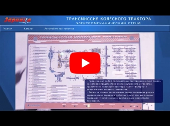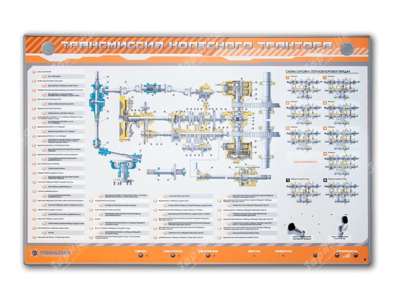 Электромеханический стенд "Трансмиссия колесного трактора" представляет собой полноцветную светодинамическую панель, на которой представлена схема внутреннего устройства трансмиссии колесного трактора марки "Беларус" с обозначением основных элементов. Также на стенде расположены схемы положения рычага переключения передач и зубчатых колес при включенных передачах с включенным и выключенным редуктором понижения. Путь взаимодействия зубчатых колес обозначен яркой линией со стрелками. В конструкцию учебного оборудования интегрированы высокочувствительные сенсоры для управления стендом при помощи интерактивного воздействия приемо-передающих устройств.