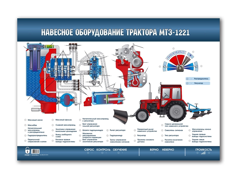 Электромеханический светодинамический стенд-планшет "Навесное оборудование трактора МТЗ-1221" представляет собой полноцветную светодинамическую панель, на которой изображены трактор, его гидравлическая система и установлены автоматические приводные плоскорельефные элементы. В конструкцию учебного оборудования интегрированы высокочувствительные сенсоры для управления стендом при помощи интерактивного воздействия приемо-передающих устройств. Предусмотрено два режима работы со стендом: "Обучение" и "Контроль".