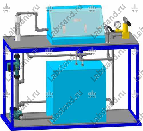 Стенд позволяет определять давление разрушения полипропиленовых труб и арматуры диаметров 20, 25 и 32 мм при различной температуре жидкости в трубопроводе. Стенд представляет собой камеру с прозрачной открывающейся дверью, в которую устанавливается исследуемый участок трубопровода. На концы исследуемого участка надеваются переходные детали с уплотнениями, фиксируемые на каркасе внутри камеры. Жидкость прокачивается по замкнутому контуру через нагреватель и трубопровод до достижения заданной температуры, после чего трубопровод отсекается и в него подается жидкость от ручного насоса. Давление в трубопроводе контролируется датчиком давления с индикацией. Блок индикации запоминает и отображает максимальное давление перед разрушением. Температура на выходе нагревателя может задаваться в диапазоне 30-80 С. Исследуемый участок должен быть спаян учащимися перед проведением испытаний.