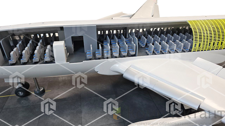 Учебный комплекс - Препарированный макет самолета Ил-96-300» должен обеспечивать подготовку специалистов авиастроительной отрасли по различным специальностям в рамках дисциплины «устройство и эксплуатация авиационной техники».  Данный комплекс представляет из себя физический масштабный макет самолета с выполненными местными разрезами в районе центральной части фюзеляжа, позволяющие изучить общую конструкцию и устройство силовых элементов фюзеляжа. Макет содержит в составе сам самолет, а также основные консоли крыла с механизацией и выпущенные стойки шасси. Макет самолета выполнен из пластика с применением металлических деталей и крепежных элементов, а также содержит действующие элементы БАНО. Также комплекс может включать в состав виртуальный учебный модуль, содержащий виртуальную трехмерную модель данного самолета, позволяющую произвести изучение внешней конструкции самолета и узлов механизации, c интерактивными подсказками и анимацией работы. Макет позволяет изучить устройство и особенности конструкции фюзеляжа.