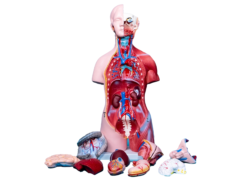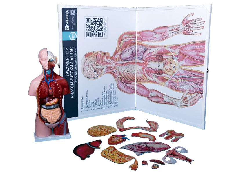 Торс человека представлен реалистичной анатомической моделью с основными антропометрическими и топографическими характеристиками. Отдельные внутренние органы могут извлекаться и использоваться в качестве наглядного пособия.
