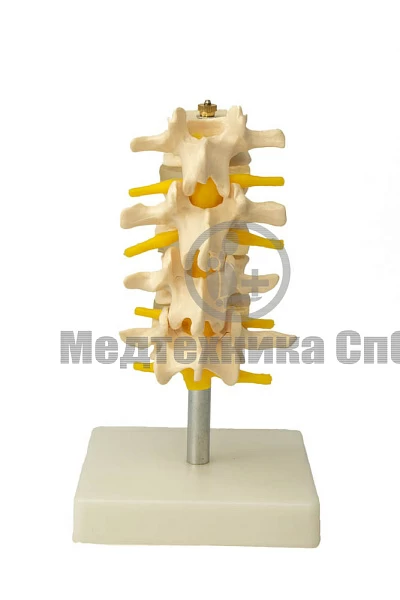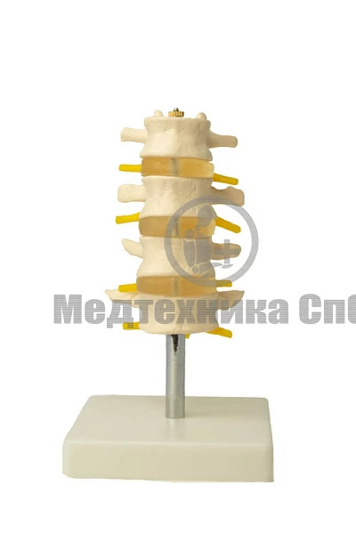 На модели представлены: поясничные позвонки L1,L2,L3 и L4, межпозвонковые диски, спинномозговые нервы и спинной мозг.
