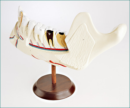 Эта прочная модель из винила демонстрирует полный набор зубов взрослого человека. Продемонстрировано строение трех зубов в разрезе: от коронки до корня: один из них — это нормальный здоровый зуб, второй — с прогрессирующим кариесом, который проник в эмаль коронки зуба и разрушает подлежащий дентин. В третьем зубе кариозное поражение стало настолько обширным, что оно включает всю внутреннюю часть зуба, а также пульпу. Названия 31 пронумерованной части модели указаны в прилагаемых ключах на двух страницах.