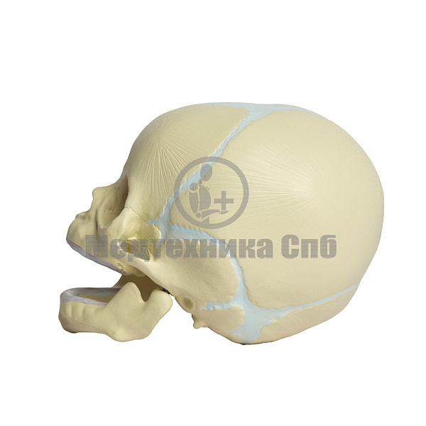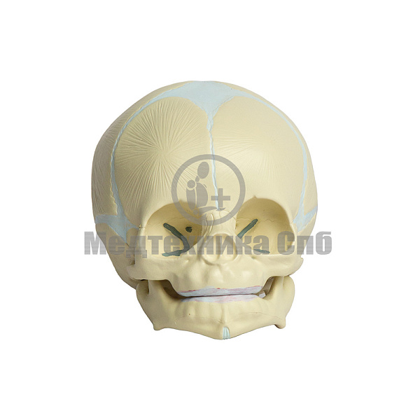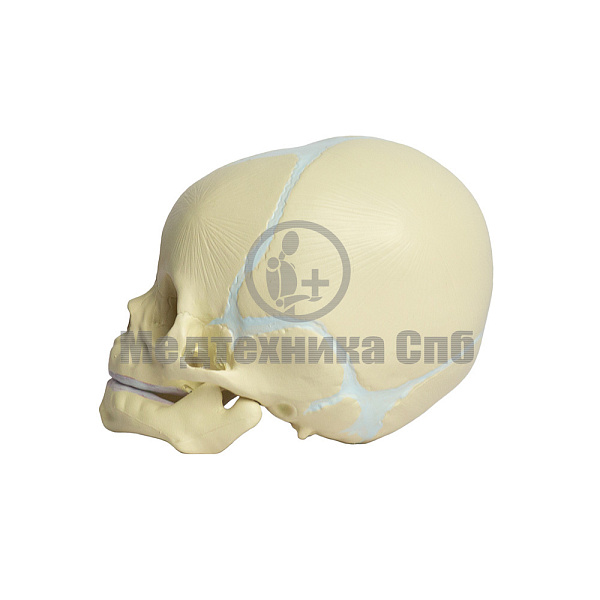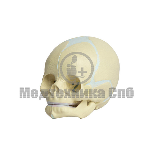 На модели представлены кости черепа новорожденного, швы и роднички. Нижняя челюсть подвижна. Модель состоит из двух лобных, двух теменных, двух височных, одной затылочной, клиновидной и решетчатой костей.