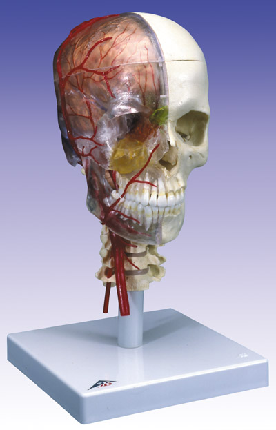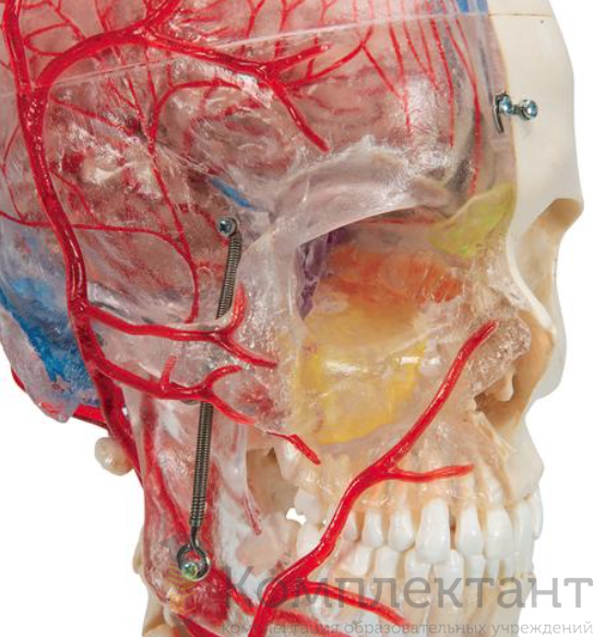 Данная уникальная технология и высокое качество исполнения модели черепа человека дают ответы решительно на все вопросы по анатомии! Эта модель даёт Вам возможность проецировать структуры прозрачной части в костяную часть, что придает такому устройству черепа специальную дидактическую ценность. С правой прозрачной стороны череп имеет параназальные пазухи, которые легко увидеть снаружи, так как они окрашены в разные цвета: верхнечелюстной пазух (желтый), решетчатые пазухи (оранжевый), лобный пазух (зеленый), клиновидный пазух (фиолетовый). Черепные полости, артерии шеи и лица также показаны в цвете: твердая оболочка мозга (голубой), общая каротидная (сонная) артерия, внешняя и внутренняя сонные артерии и ответвления менингиальной артерии (красный). Одна половина мозга, которую можно рассмотреть сквозь черепную коробку, дает представление о расположении мозга и направлении пазух. Периодонтальные мешочки и корни зубов можно изучать сквозь прозрачную челюсть. Нижняя челюсть имеет гибкое крепление для показа жевательных движений. Череп крепится на шейных позвонках, и он может разбираться на две половины черепной коробки, левую половину основания черепа, перегородку носовой кости, полную нижнею челюсть и половину мозга. Модель сделана из материала BONElike™, который точно копирует натуральную костную структуру. Модели костей, выполненные из этого материала, имеют абсолютно естественный вид, почти такой же вес что и натуральная кость.