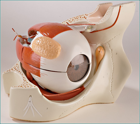 Эта прочная модель глазного яблока из винила с увеличением в шесть раз (она в два раза больше, чем модели конкурирующих производителей) состоит из восьми частей. Глазное яблоко находится в глазной впадине, что позволяет лучше понять его связь с крупными кровеносными сосудами, мышцами и нервами. Видны все шесть глазодвигательных мышц, и можно извлечь верхнюю половину глазного яблока со слезной железой. Модель содержит съемные элементы: верхнюю и наружную прямые мышцы, радужную оболочку и роговицу, которые снимаются вместе, люцитовую линзу, которая увеличивает и переворачивает изображения, и прозрачное стекловидное тело, под которым находится центральная ямка на сетчатке глаза. Также присутствует хороидная оболочка, сетчатка и диск зрительного нерва, а также схематический разрез слоев сетчатки. 77 элементов, на которые номер нанесен вручную, указаны в прилагаемых ключах. Также в комплект входит документ в черно-белом формате, предназначенный для размножения путем фотокопирования, где пронумерованные части соответствуют модели, что позволяет печатать иллюстрированный раздаточный материал для обучения. Ключи на обратной стороне.