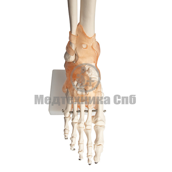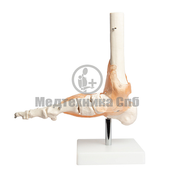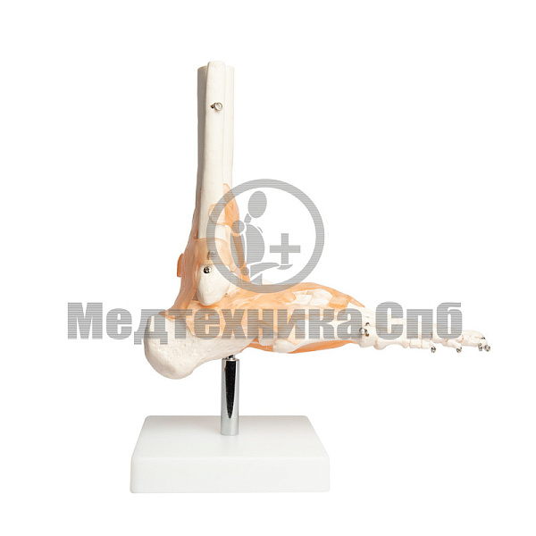 Модель состоит из фрагментов большеберцовой и малоберцовой костей и костей стопы (кости предплюсны, плюсны и фаланг пальцев). Так же представлены связки голеностопного сустава. Модель устанавливается на подставку с опорой, изготовлена из ПВХ.