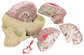 Полноразмерная модель головного мозга, разделенного на сегменты, включает здоровую половину и половину с патологиями, разделенную на 3 части, а также артериальный круг большого мозга с аневризмой. В головном мозге, который находится внутри части черепа, наблюдаются следующие патологии (они также указаны на двусторонней карточке): алкоголизм, болезнь Альцгеймера, аневризма, вызванная депрессией опухоль, вызванная припадками опухоль, мигрень, рассеянный склероз, болезнь Паркинсона, инсульт и субдуральная гематома.