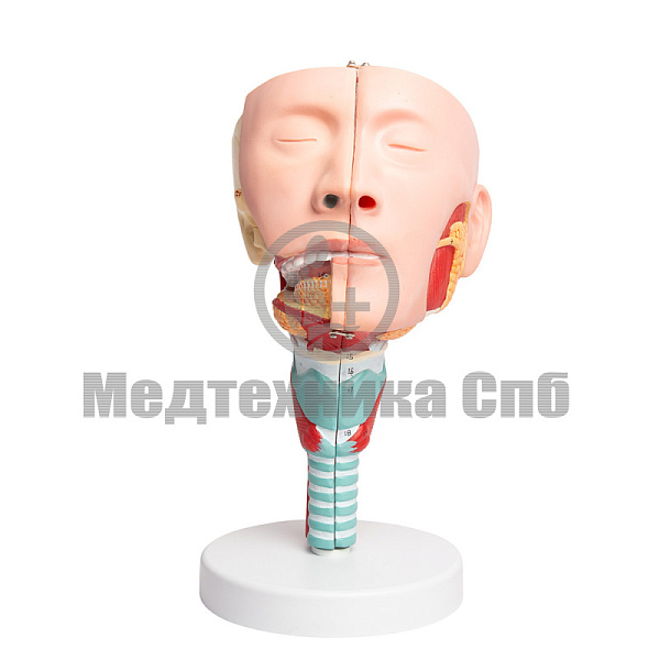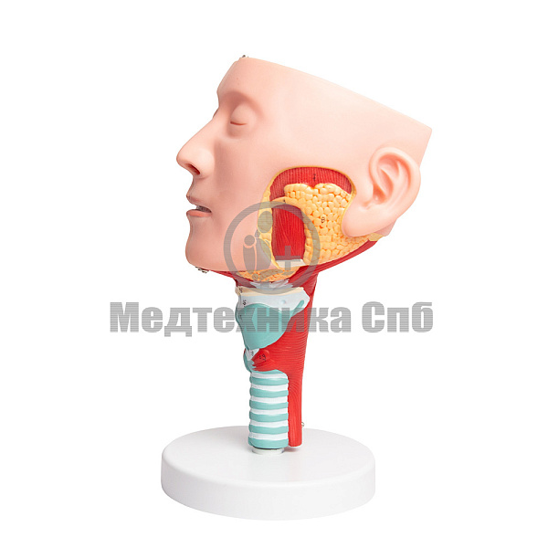 На модели наглядно представлено анатомическое строение глотки; носовой и ротовой полостей, гортани. Показаны мышцы и железы.