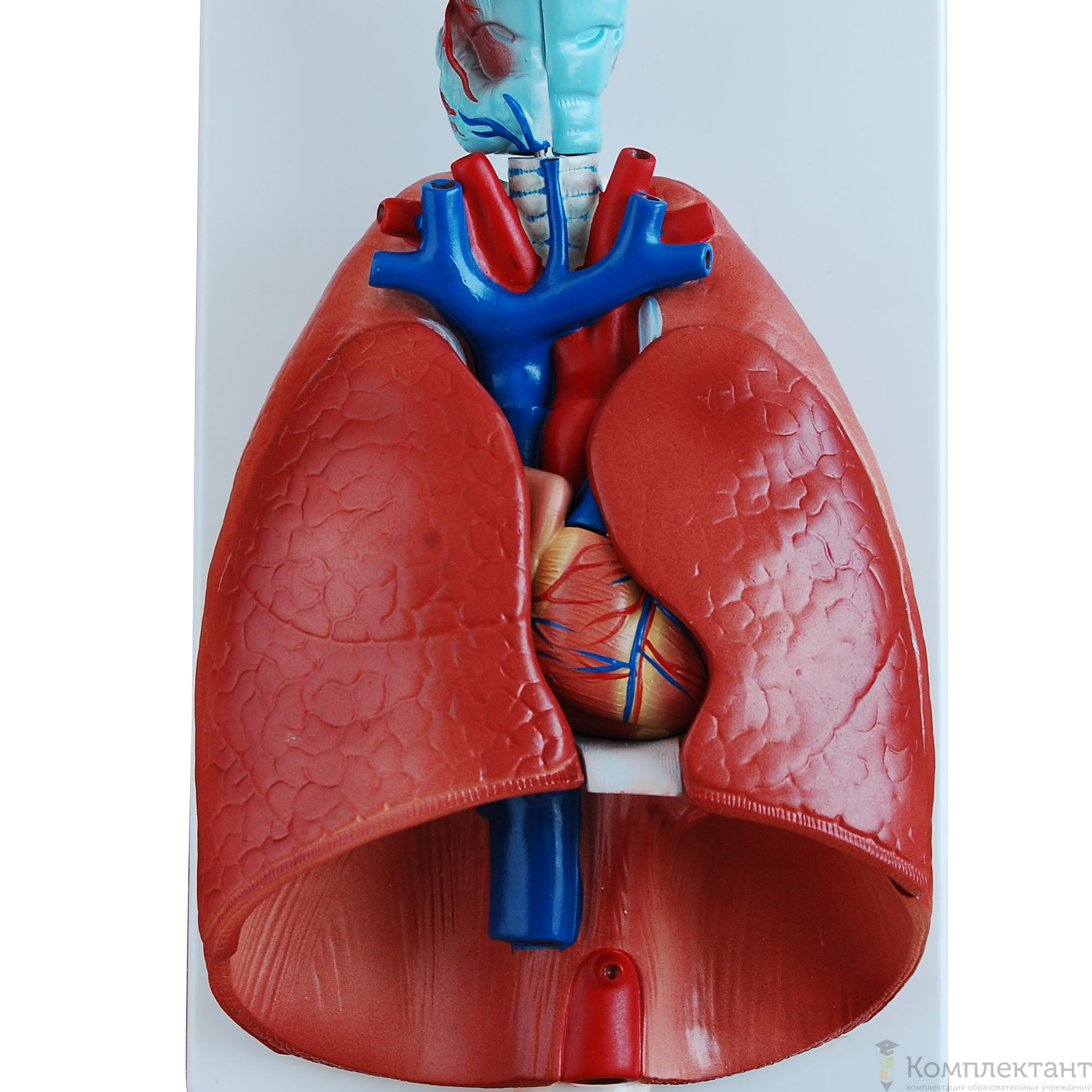 В составе модели показаны следующие органы и анатомические структуры: гортань, сердце, трахея, лёгкие с бронхами и сосудами, подключичные артерия и вена, аорта, легочная артерия, полая вена