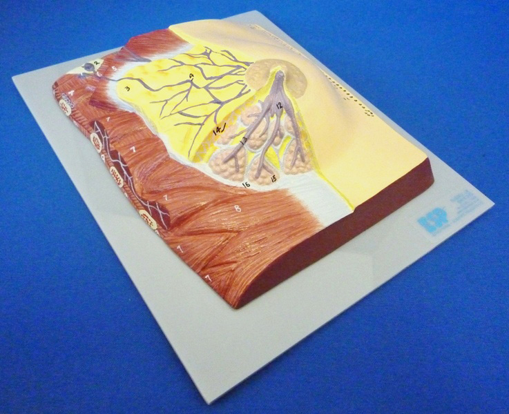 Левая половина этой полноразмерной модели женской правой груди демонстрирует кожный покров и контур груди, а правая половина — грудь в разрезах с разной глубиной. В верхней правой четверти удалена поверхностная ткань и виден нижележащий жировой слой и лимфатические сосуды. В нижней правой четверти жир удален и видны молочные железы, млечные протоки и пазухи. Четко показаны поддерживающие связки и соединительная ткань вместе с соответствующими мышцами и ребрами. Поставляется с карточкой с ключами.