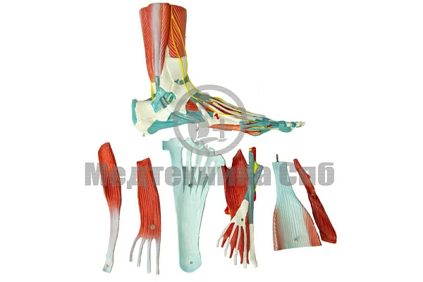 На дорсальной части модели можно снять икроножную мышцу. Подошва модели стопы представлена тремя слоями, показывает короткий сгибатель пальцев, квадратную мышцу подошвы, сухожилие длинного сгибателя пальцев и мышцу - сгибатель большого пальца.