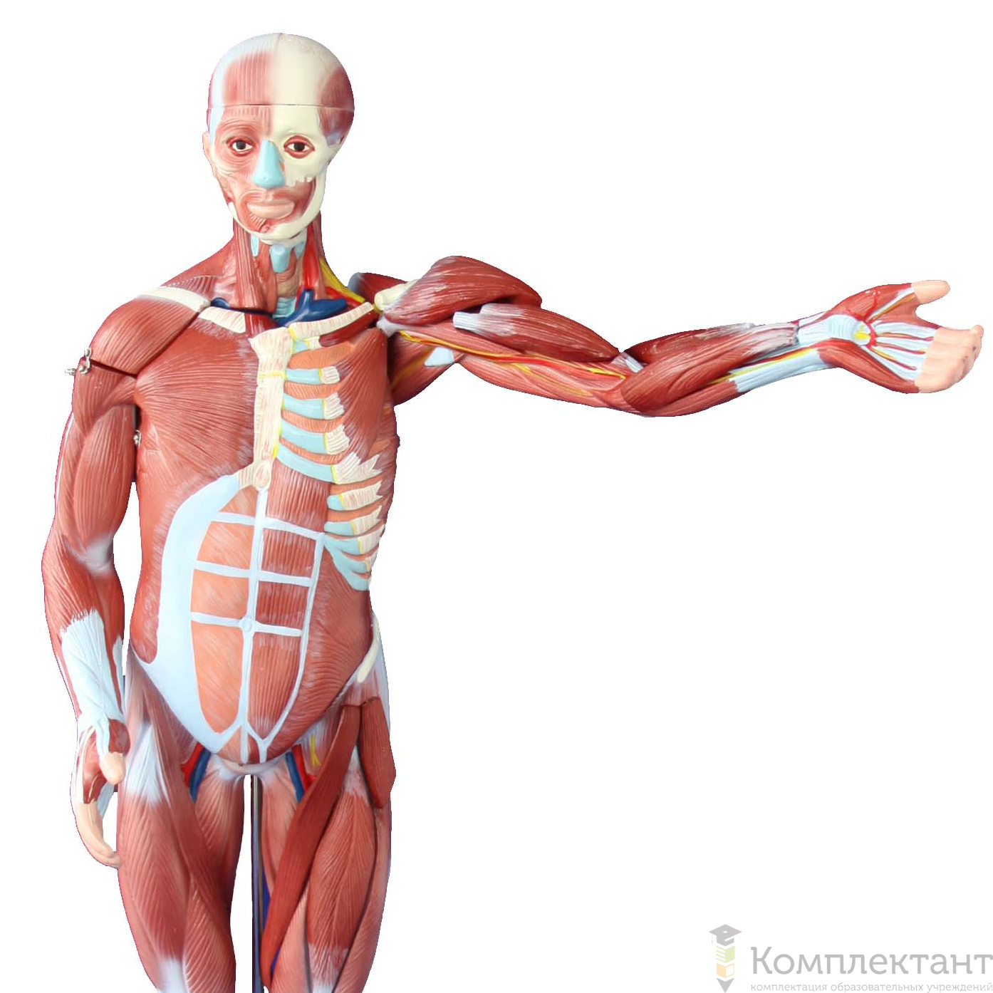 Модель мышечной системы человека это высокодетализированный анатомический фантом ростом 80 см, состоящий из 27 съёмных частей, включая мышцы, внутренние органы и скелетные элементы. Каждая мышца выкрашена в отдельный цвет, что позволяет наглядно изучать их расположение, прикрепление и функцию. Модель идеально подходит для преподавания анатомии в медицинских и образовательных учреждениях, а также для демонстрации на лекциях и курсах. Устойчивый штатив и прочные материалы обеспечивают долговечность и удобство в использовании.