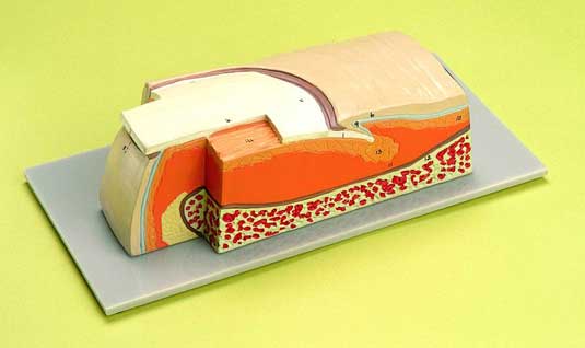 Эта модель ногтя пальца со структурой костной ткани (с увеличением примерно в 5 раз) демонстрирует корень ногтя, ложе ногтя, герминативную зону и кость в трех разрезах. Номера элементов указаны на карточке. Располагается на подставке размером 25,5x12,5 см