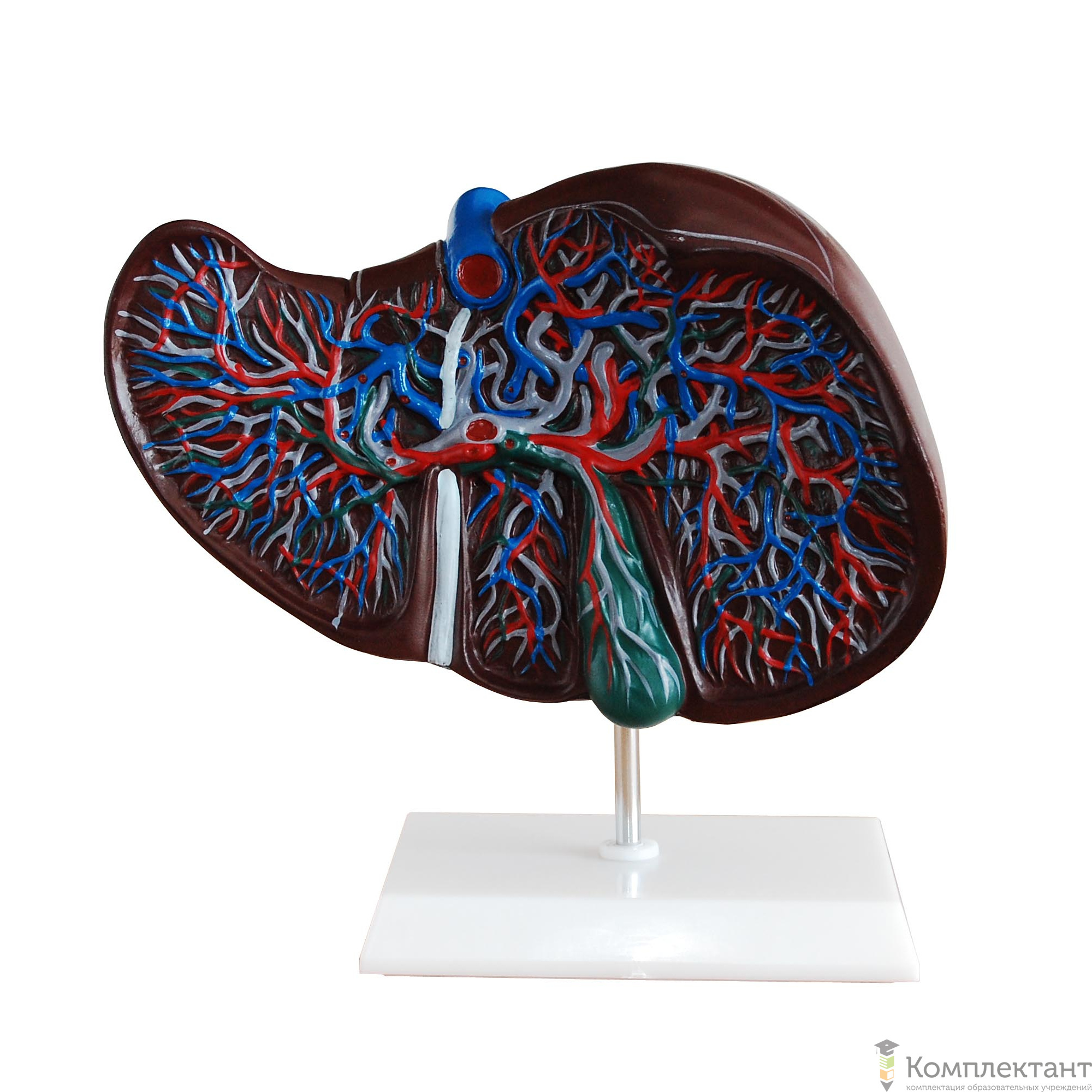 Модель показывает коронарную связку, фальциформную связку, треугольную связку, связку тереса ,гепатит, желчный пузырь. Он также показывает лобус зловещий, лобус гепатит декстер, лобус квадратный, лобус хвостатый и некоторые структуры A. hepatica propria, V. portae, V. cava inferior, vesica fellea и др. Сложная сеть сосудов в открытой печени, отображенная в разных цветах на этой модели, внепеченочные и внутрипеченочные желчные протоки.