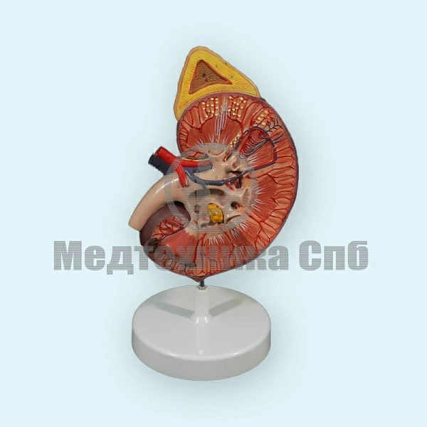 Увеличенная модель почки с надпочечником на подставке (арт. SMD0645) — наглядное пособие для анатомии и медицины. Подробности строения органов, четкость деталей и практичность делают её незаменимой для учебных заведений и клиник. Купите сейчас и изучайте анатомию наглядно!