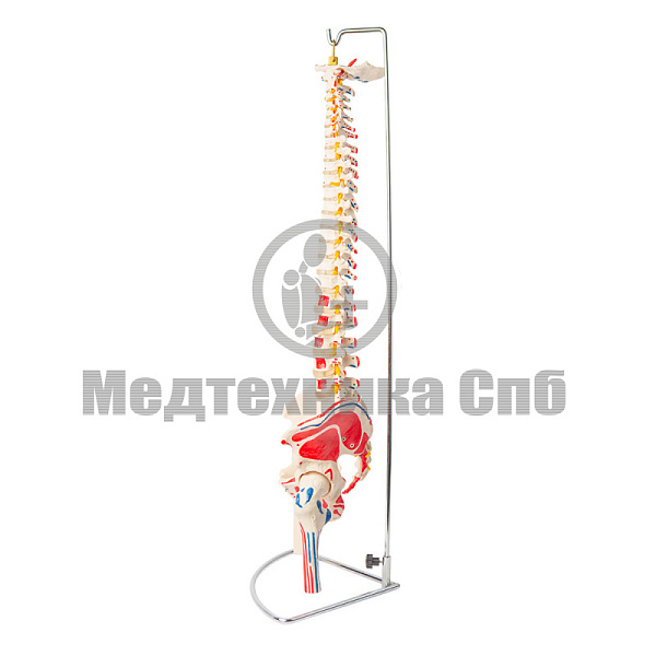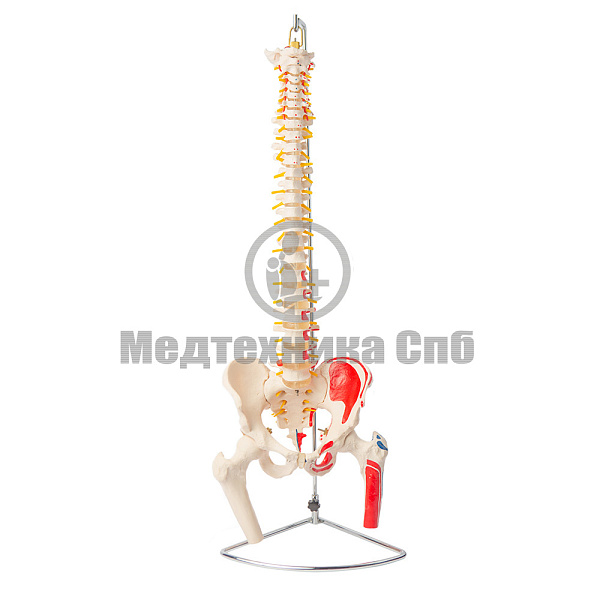 Модель позвоночника с костями таза, головками бедренных костей и раскрашенными местами прикрепления мышц (на штативе) (арт. YAL036A)