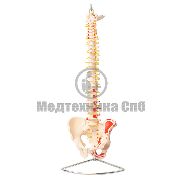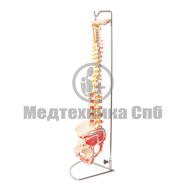 Модель позвоночника с костями таза и раскрашенными местами прикрепления мышц (на штативе) (арт. YAL037A)