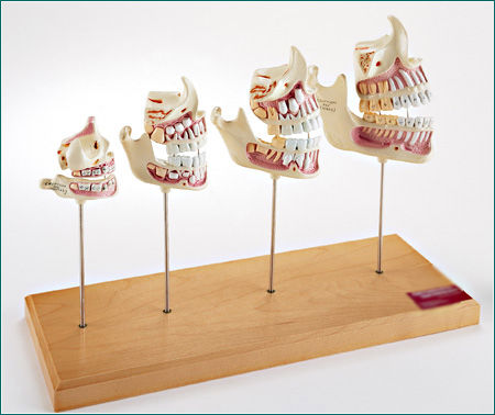 Четыре полноразмерные прочные модели из пластика располагаются на одной подставке из твердой древесины, которые демонстрируют развитие челюстей и зубов человека от рождения до взрослого возраста. Каждая модель изображает правую половину верхней и нижней челюсти в разрезе и демонстрирует корни зубов и развивающиеся зубы на челюстях. В этот набор входят модели челюсти новорожденного ребенка, 5-летнего, 9-летнего ребенка и взрослого человека. Цветом обозначены сменяемые зубы, замещающие и добавленные постоянные зубы.