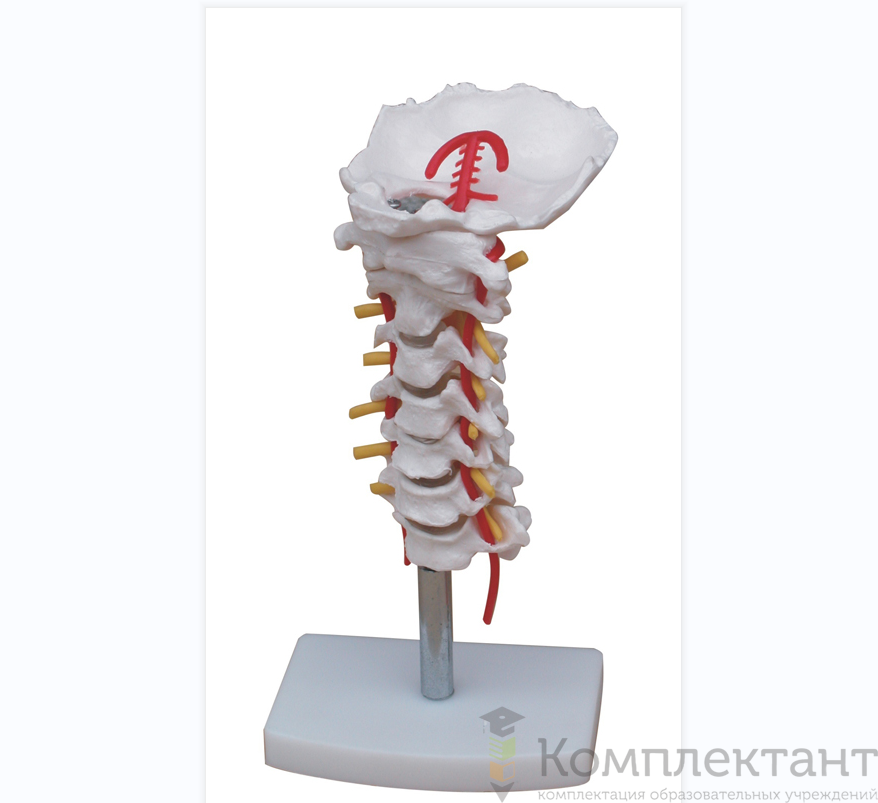 - Модель шейного отдела позвоночника в натуральную величину состоит из затылочной кости и 7 шейных позвонков с межпозвоночными дисками, шейных нервов, позвоночных артерий и спинного мозга.