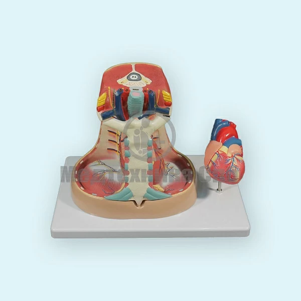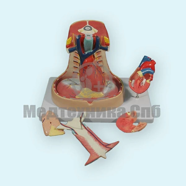 Модель средостения со съемной грудиной и тимусом (вилочковой железой) открывает для обзора полость перикарда, основные лёгочные и системные кровеносные сосуды.