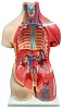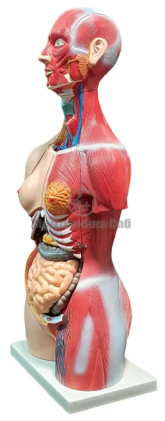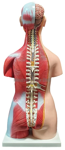 На левой стороне представлены основные поверхностные и более глубокие мышцы. Спина открыта, показаны слои мышц, позвоночный столб и ветви нервов. Съемный грудной позвонок с разрезом спинного мозга позволяют детально изучить его анатомическое строение.
