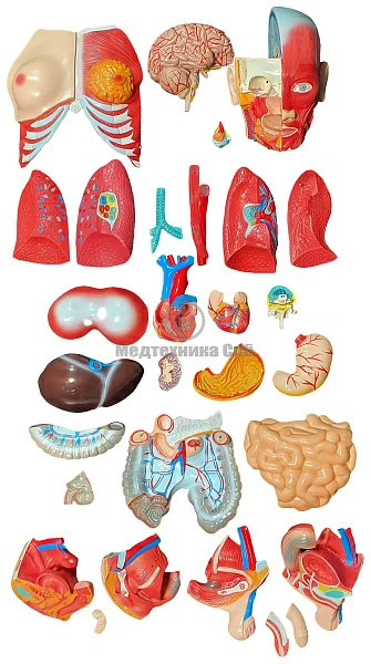 Голова открыта, видна половина головного мозга. Съемный глаз со зрительным нервом и глазодвигательными мышцами. Разрез шеи обнажает структуру мышц, нервов, сосудов и желез.