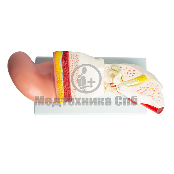 Модель разработана как демонстрационный материал к курсу анатомии в общеобразовательных школах, средних и высших медицинских учебных заведениях. Изготовлена из поливинилхлорида (ПВХ), закреплена на подставке.