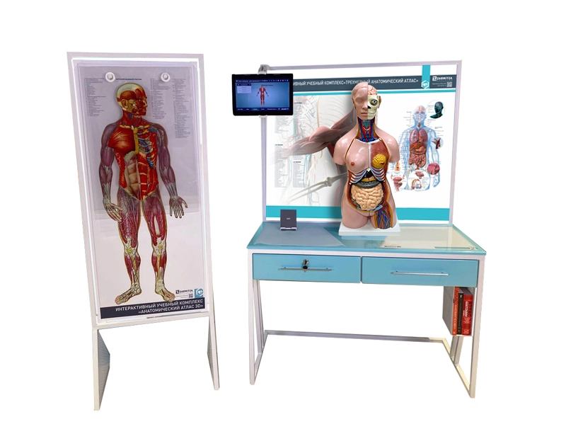 Функциональной частью трехмерного анатомического атласа является инновационная система с визуализацией органов человека (легкие, трахея, альвеолы, сердце и его клапаны, органы брюшной полости, медиальный срез сердца, кровеносная система). Для этого на тренажёре есть метка дополненной реальности.