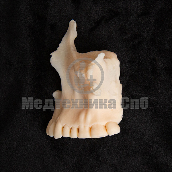 Анатомический макет представляет собой точную копию фрагмента кости верхней челюсти человека, которая изготовлена путем сканирования с натуры анатомического образца и произведена методом фотополимерной 3D-печати.