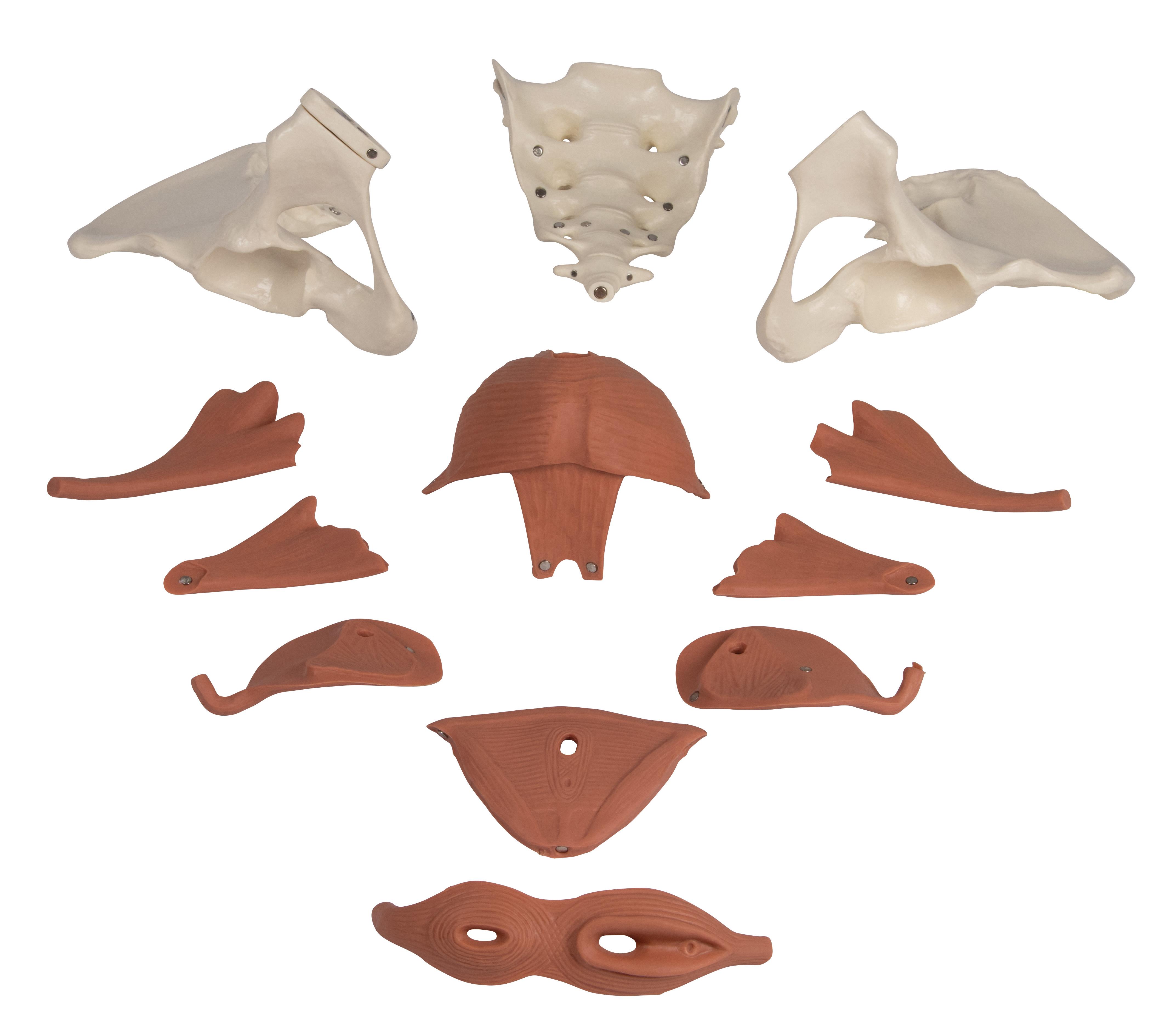 Вместе с обеими половинами таза и крестцом модель состоит в общей сложности из 12 частей. Мышцы посажены на штифты таким образом, чтобы их можно было легко снять для демонстрации отдельных слоев.
