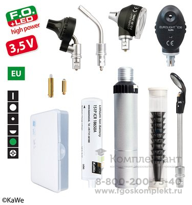 Универсальный набор Комбилайт F.0.30 LED/E36, 3,5 В позволяет осматривать глазное дно, слуховые проходы пациентов. Этот комплект станет незаменимым в практике семейного врача. Интенсивность свечения регулируется клик-замком. Головка офтальмоскопа работает от галогеновой лампочки, головка отоскопа - от светодиодной. Фиброоптический отоскоп оснащён лупой с 3-кратным увеличением. Диапазон линз офтальмоскопа - -20 …+20 дптр.