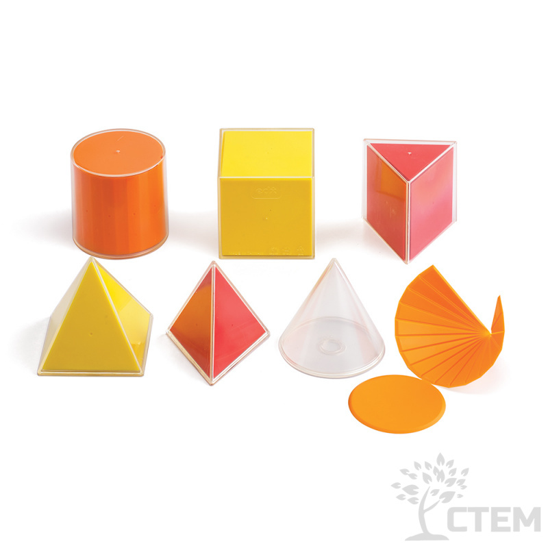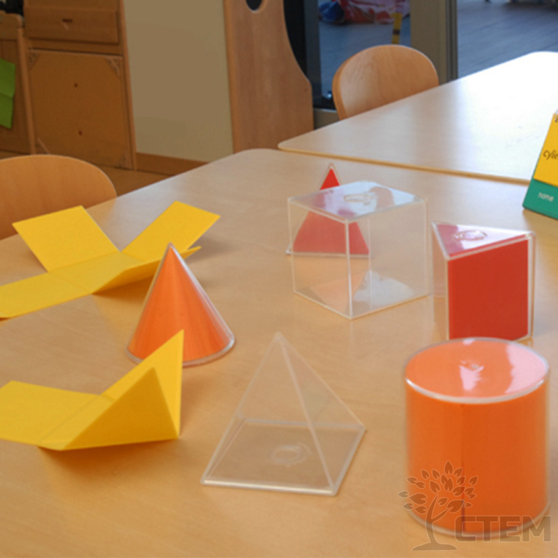 Вводный набор из 6 складных геотел 2D/3D, включая куб, цилиндр, конус, треугольную призму, квадратную пирамиду и треугольную пирамиду. Твердые тела имеют основание 8 см. В комплект входит руководство.