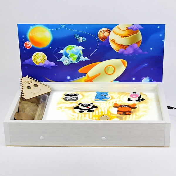 В комплекте: световой планшет, крышка, песок, подсветка, яркий корпус, отсек для инструментов и песка.