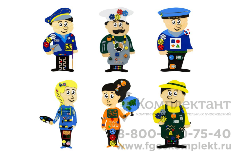 Набор бизибордов «Город профессий» состоит из шести бизибордов. Каждый из них знакомит детей с разными профессиями, рассказывает об их особенностях. Панели подойдут для дошкольников и младших школьников. Можно использовать в детских садах, школах, развивающих и развлекательных центрах, в кабинетах психолога или логопеда, дома.