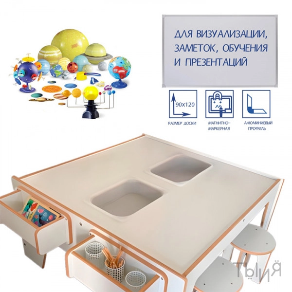 - стол для групповой работы с удобными боковыми полочками для хранения;